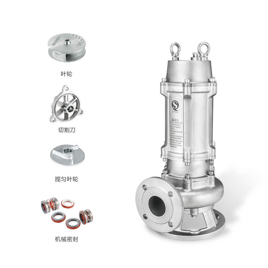 国标法兰WQ-S全不锈钢精密铸造污水污物潜水电泵采用不锈钢精密铸造外壳,具有耐腐蚀、环保型、扬程高、流量大等特点。